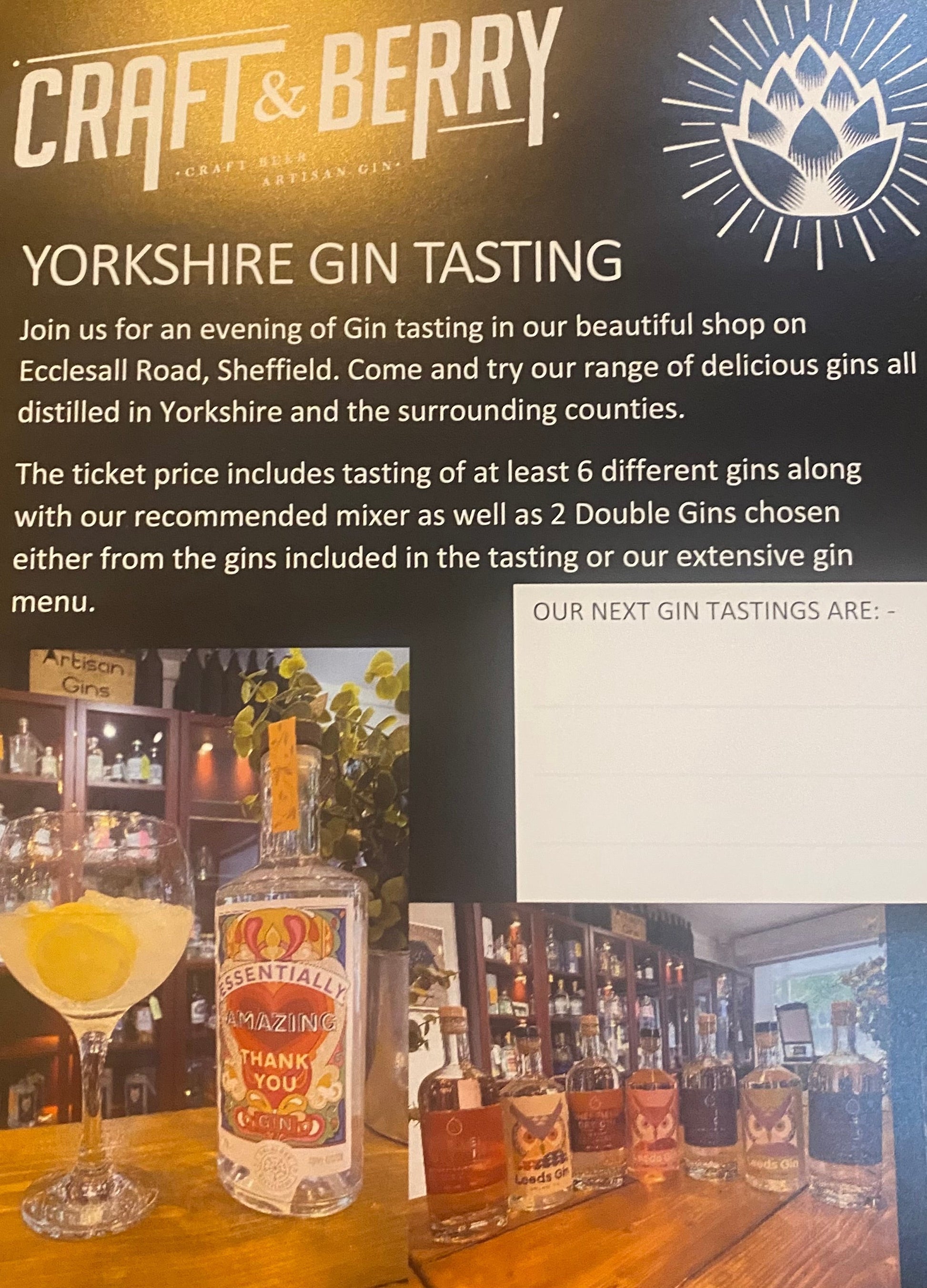 An evening of Gin tasting in our beautiful shop on Ecclesall Road, Sheffield. Come and try our range of delicious gins all distilled in Yorkshire and the surrounding counties.